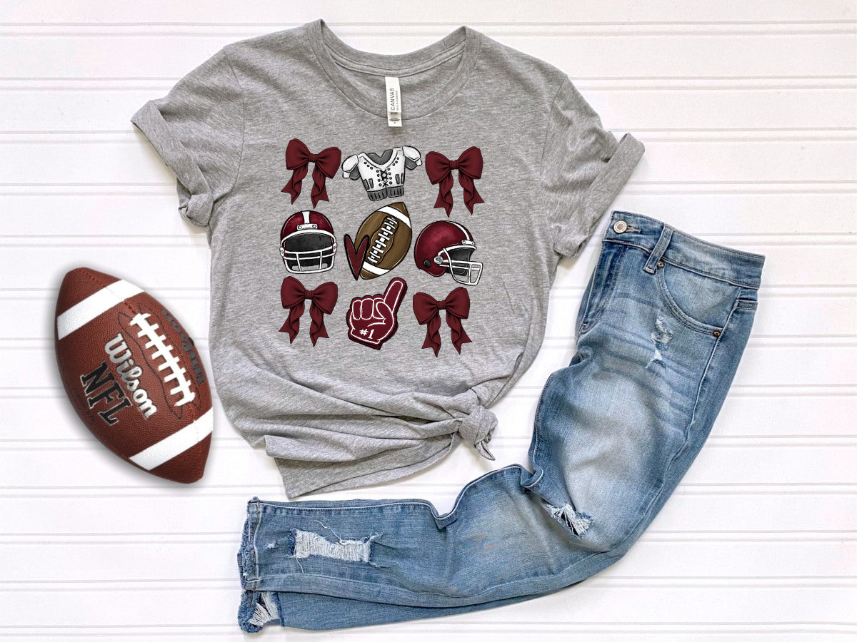 Show off your love for the game with our Football Croquette Maroon Shirt! Featuring a fun combination of football and bows, this shirt is perfect for displaying your school spirit. Stay stylish and spirited at the game or on campus. Go team!